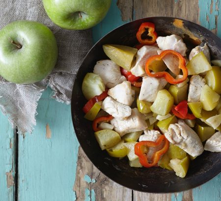 INGREDIENTS 4 chicken breasts 2 green apples 1 sweet red pepper (Florina pepper) 2 garlic cloves 1 onion ½ cup Horio PDO Kalamata olive oil ½ cup white wine juice of 1 lemon some oregano salt and pepper | | DIRECTIONS- Rinse and cut the apples into cubes. Put them in a bowl and pour over the lemon juice so as not to blacken.