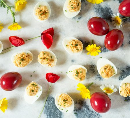 - Με ένα κουταλάκι γεμίζουμε τα ανοίγματα που άφησαν οι κρόκοι στα ασπράδια, μοιράζοντας όλο το μείγμα. Πασπαλίζουμε με την έξτρα πάπρικα και το ψιλοκομμένο σχοινόπρασο. Σερβίρουμε σε πιατέλα σαν ορεκτικό ή finger food.
