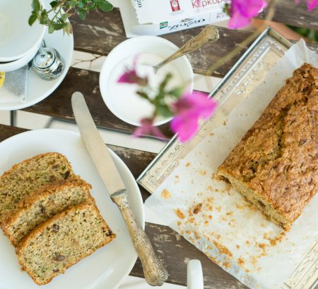 ΥΛΙΚΑ 200 γρ αλεύρι που φουσκώνει μόνο του 200 γρ καστανή ζάχαρη κρυσταλλική ½ κουτ. γλυκού αλάτι ¾ κουτ. γλυκού κανέλα 2 αυγά 70 γρ (5 κουτ. σούπας) βούτυρο Χωριό Κερκύρας, λιωμένο 1 κουτ. γλυκού εκχύλισμα βανίλιας 2 κουτ. σούπας νερό 170 γρ κολοκυθάκι, τριμμένο στον χοντρό τρίφτη (δεν θέλει στράγγισμα) 70 γρ σταφίδες σουλτανίνα | | ΕΚΤΕΛΕΣΗ- Προθερμαίνουμε τον φούρνο στους 160C στον αέρα (180C αντιστάσεις). Λαδώνουμε ελαφρά ένα ορθογώνιο ταψάκι μήκους 25εκ. και το στρώνουμε με λαδόκολλα.
