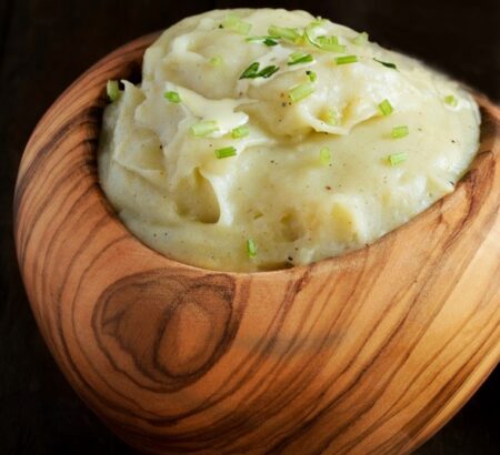 - Μόλις ο πουρές είναι έτοιμος, προσθέτουμε 1 κουταλάκι του γλυκού βούτυρο, χωρίς να ανακατέψουμε, ώστε όταν λιώσει το βούτυρο να καλύψει την επιφάνεια του πουρέ για να μην στεγνώσει.